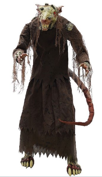 Add this loathsome 60" Mangey Rat Prop to your next haunted setting to truly scare your guests! Standing rat animated prop chitters and squeaks while his sharp-toothed mouth moves. His arms move up and down, and his head turns side to side, with red LED light-up eyes. His ragged brown robe has dangling befouled tattered gauzy sleeves. His large rat tail wraps aound to the front, and he has disgusting large-clawed rat feet. Spooky sounds play in the background. Plugs into any normal wall outlet. Complete assembly instructions are included