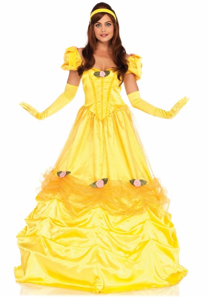3pc Bell of the Ball includes a long satin ball gown, head piece and clear straps Inspired by Belle from Beauty and the Beast Adult Women's size Small Dress Size: 4-6 Bust: 34.5"-35.5" Waist: 26"-27" Hip: 36"-37"