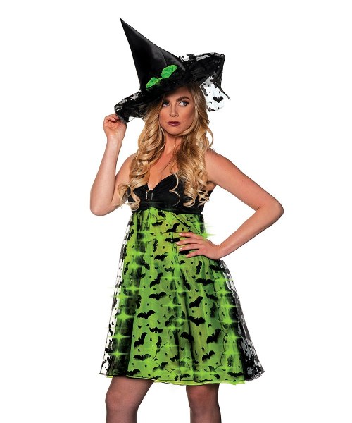 Includes: - Light up empire style tank top bat embossed mini dress - Detailed lace hat