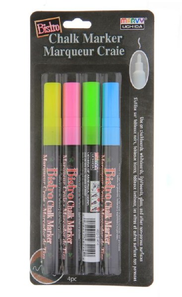 Flourescent green, yellow, pink, blue Use on chalkboards, whiteboards, lightboards, glass, and other non-porous surfaces