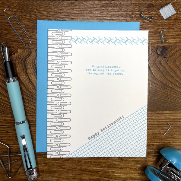 "Congratulations, way to keep it together throughout the years." Blank inside, retirement card