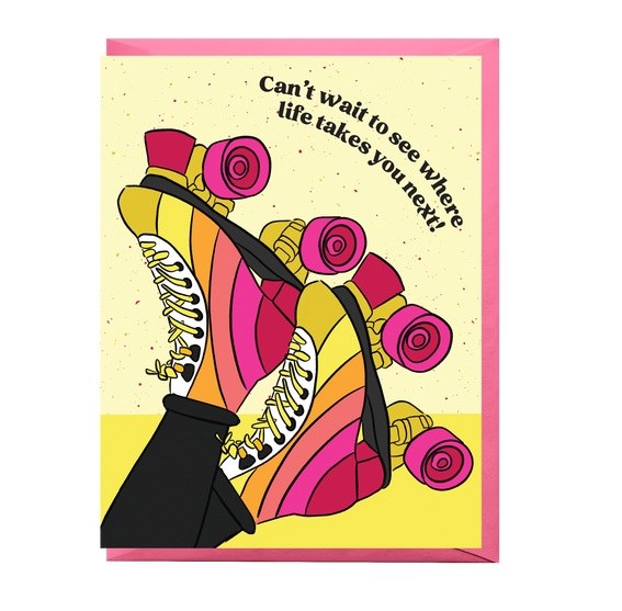 "Can't wait to see where life takes you next!" Generic congrats or graduation card, blank inside