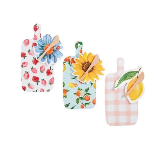 3-piece set includes one shatterproof melamine paddle board, one wooden spreader and pack of 12 paper napkins *pictured bottom right