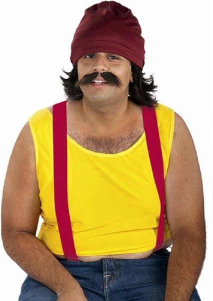 Includes: - Cap - Wig - Self-adhesive 2pc moustache