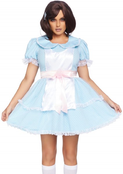 2 PC Creepy Sibling, includes dotted babydoll dress with attached satin bow sash and flower hair clip.