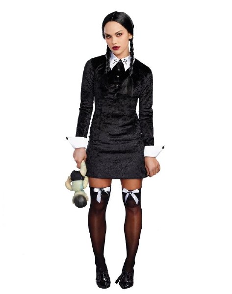 Dreamgirl's "Friday" costume features a creepy black velvet dress with cross buttons, white-collar and crosses screen-printed details on the lapel