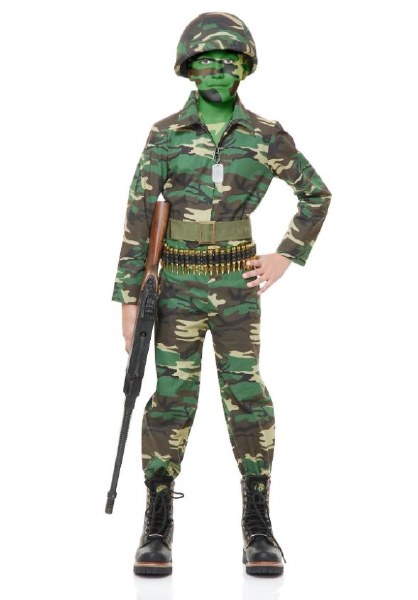 Camo army jumpsuit with canvas belt. Charades Child Size Guide - Medium (8-10) Height: 48"-57" Chest: 29.5"-30" Waist: 24"-25.5"