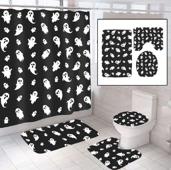 Includes: - Shower curtain & rings - Rug - Toilet seat cover - Toilet rug 100% Polyester