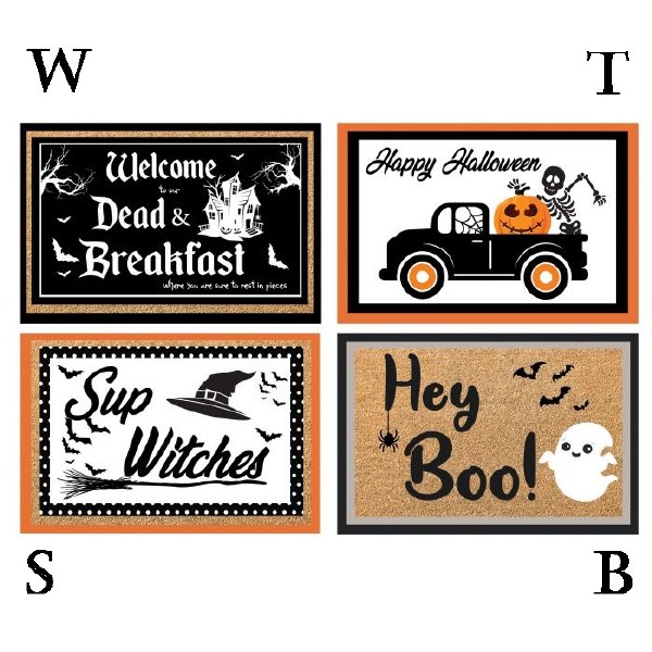 24 inch x 16 inch door mat with Halloween-themed prints. Assorted styles include: