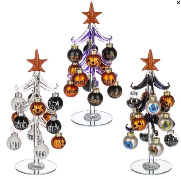 Glass Halloween Tree with Ornaments Available in Clear, Purple, or Black Please specify color choice at checkout!