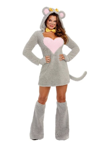 This adorable mouse costume is so fuzzy and warm! Features a sherpa dress with attached hood & furry inset heart bodice detail, fingerless gloves and boot covers. Also includes a satin cheese printed bow tie and removeable tail.