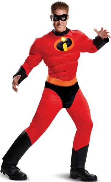Includes jumpsuit with muscle torso and arms plus detachable belt and eye mask