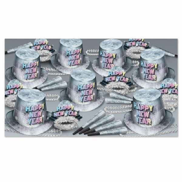 Includes: 25 - Printed Foil Hi-Hats 25 - Printed Foil Fringed Tiaras 50 - 9" Printed Foil Horns 25 - 33" Party Beads