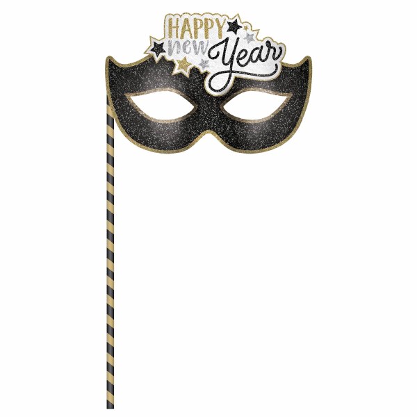 New Years Mask On A Stick Black, Silver, Gold 13" x 7" Glitter
