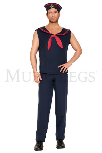 Costume Includes: - Navy Sleeveless Shirt w/ Sailor Collar - Matching Pants - Hat