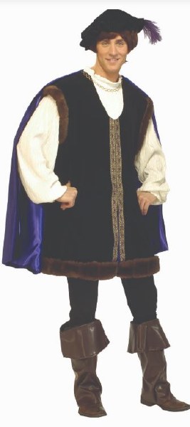 Designer Collection Noble Lord costume includes: - tunic with faux fur trim and collar - pants - hat with feather - boot tops Adult medium fits jacket sizes 42-44.