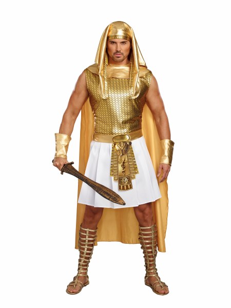 This Lord of Egypt is every woman's desire with his metallic gold sleeveless shirt, Egyptian collar with attached gold cape, wrist gauntlets, Royal Nemes headpiece and Egyptian Shendyt skirt with embellished waistband.