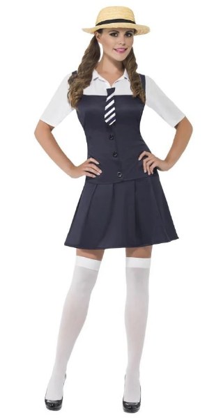 Includes dress, attached shirt, tie and boater hat Adult size Medium (10-12) Bust: 37" - 38.5" Wasit: 29" - 30.5" Hips: 39.5" - 41"