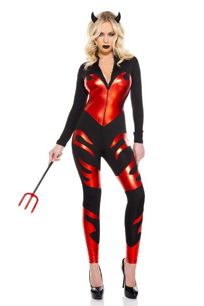Turn up the heat in this Sizzling Devil costume featuring a black jumpsuit with long sleeves, a front zipper closure, red flame detailing, a black horn headband, and a toy pitchfork.