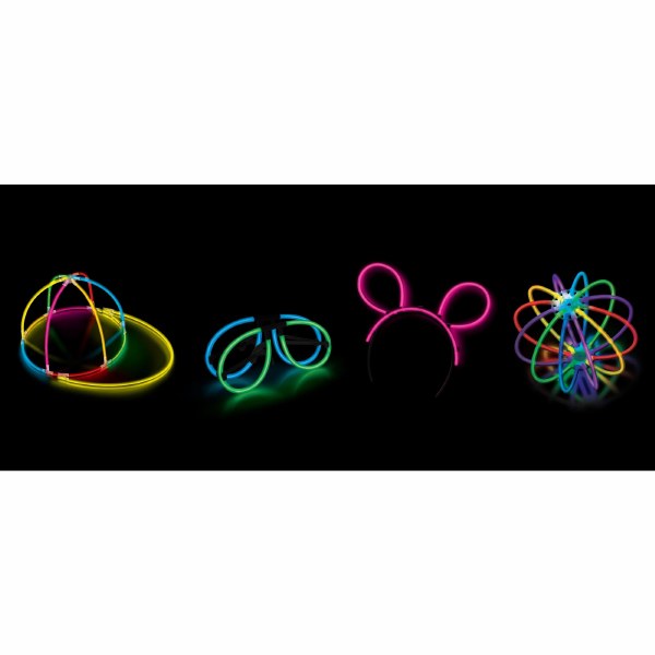 26 Glow Sticks, 8" 12 Glow Sticks, 5 1/2" 12 Glow Sticks, 3 1/2" 6 Eyeglass Connectors 2 Headband Connectors 2 Ball Connectors 20 Cap Connectors 6 1/4" x 10 1/2" (Pkg. Size)