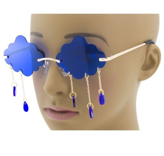 Colored lens sunglasses in the shape of clouds with hanging raindrop jewels. Assorted colors.