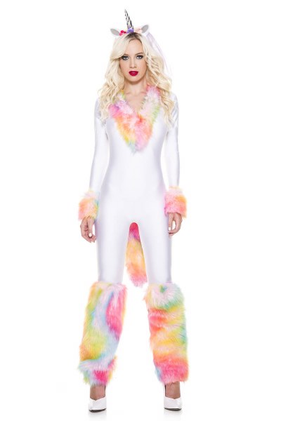 4 PC. includes: White catsuit with faux fur trim, faux fur rainbow tail, silver horn headband, and rainbow leg warmers Size 0-2